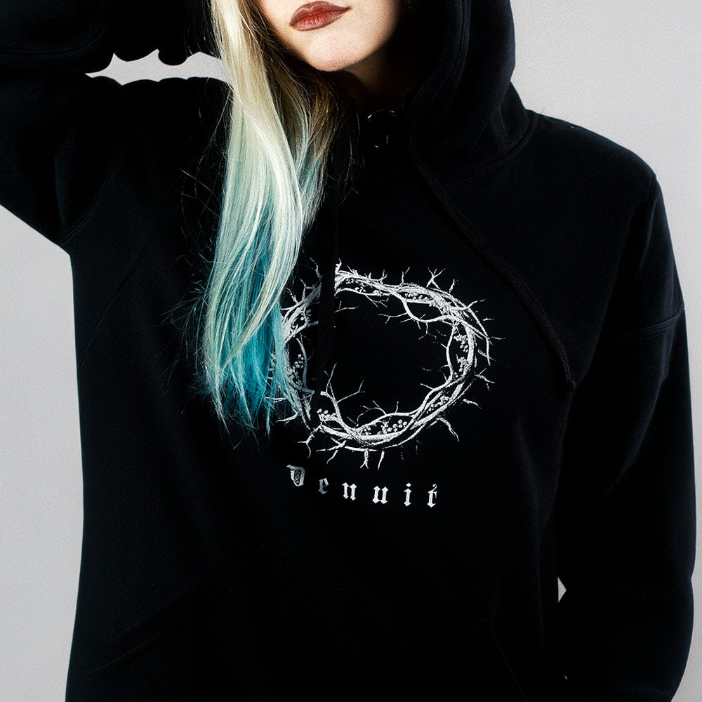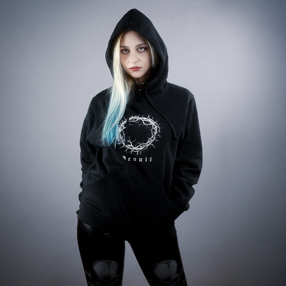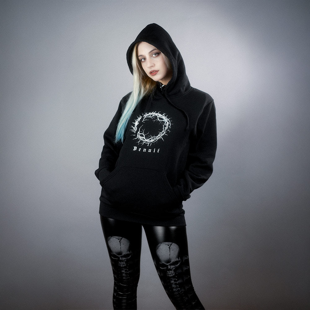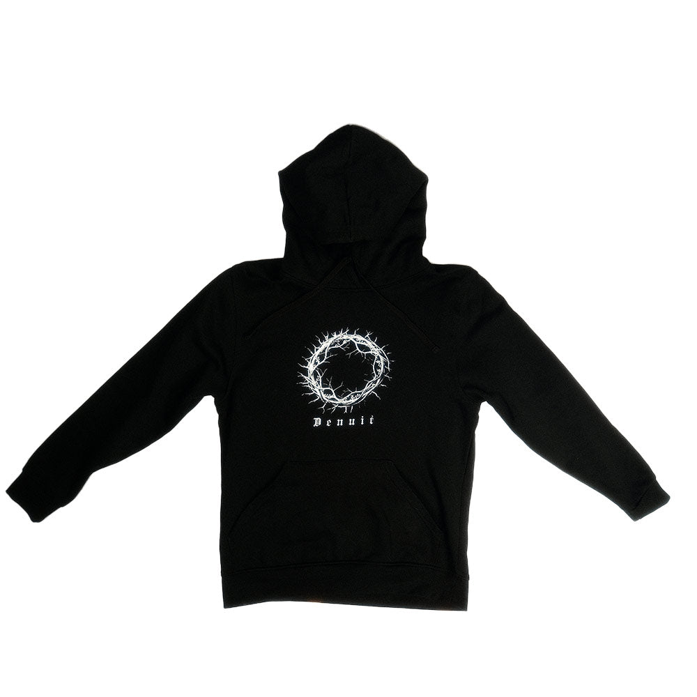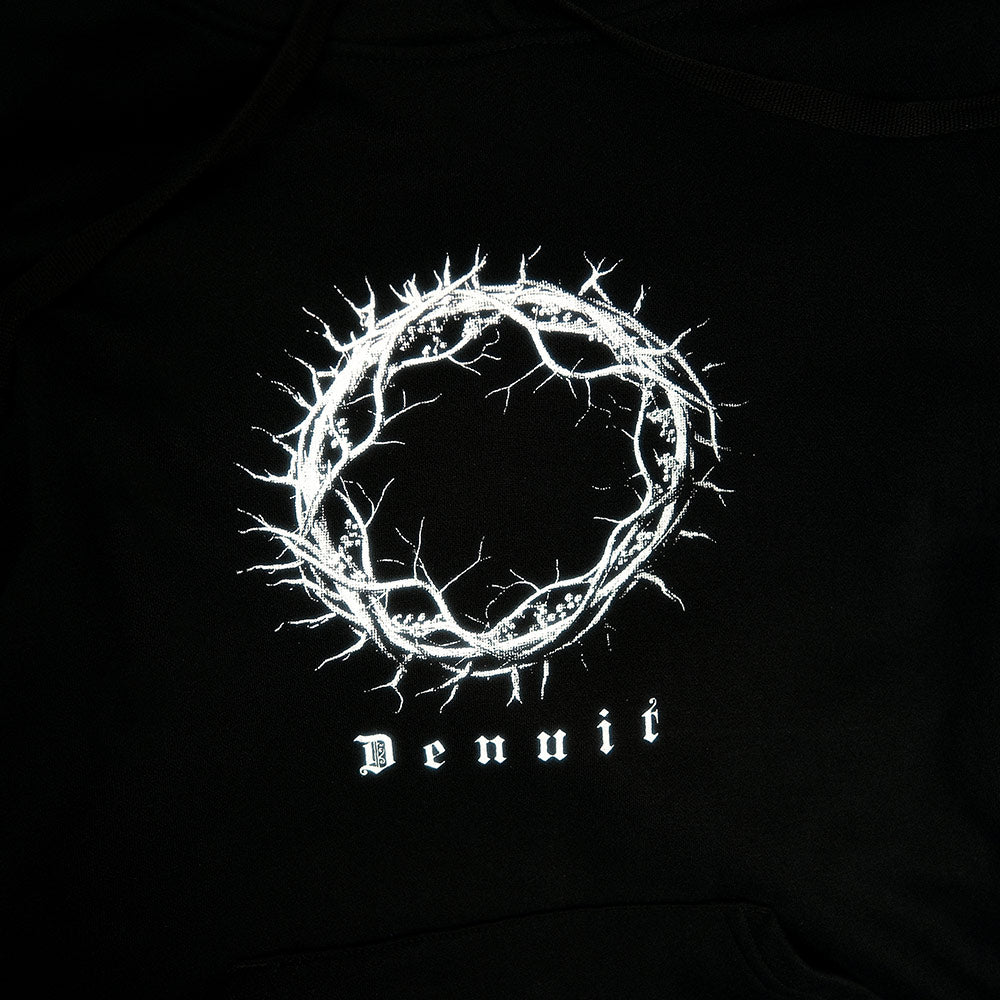Hand screen-printed by Denuit, this hoodie features a white circle of thorns — a symbol of infinity, life’s trials, and the light within darkness.